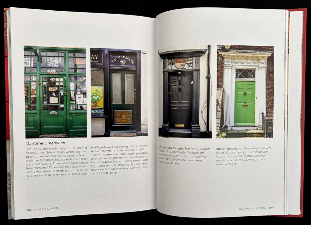 One chapter, Chapter 8, is dedicated to Greenwich in particular – along with Deptford, Lewisham, New Cross and Blackheath. Some of the doors featured in these localities include:
