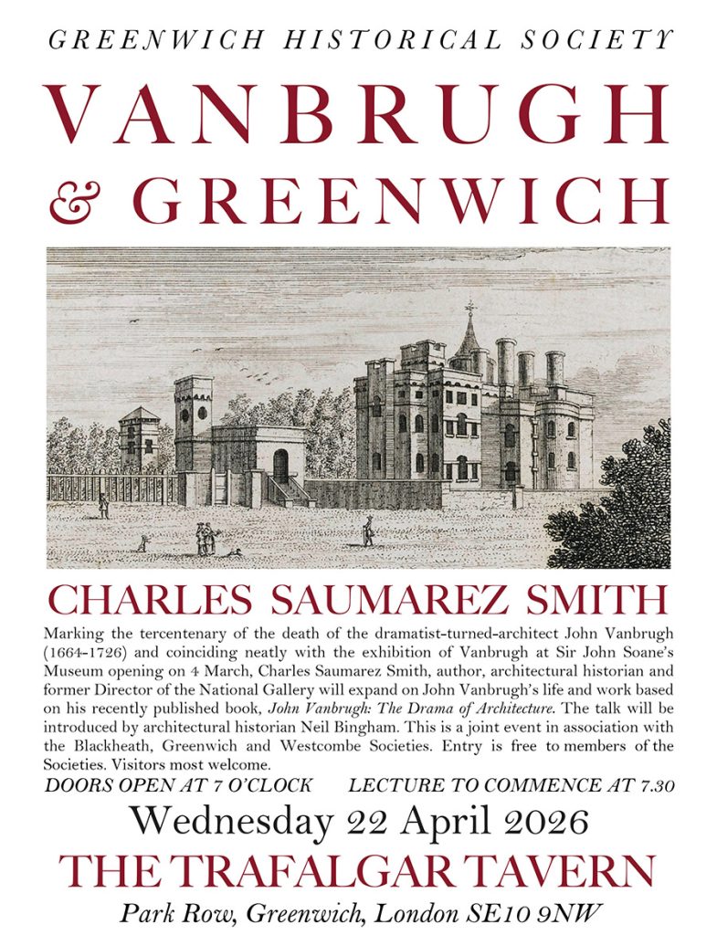 22 APRIL – VANBRUGH 3OO – Charles Saumarez-Smith. Marking the tercentenary of the death of the architect and dramatist John Vanbrugh (1664-1726), and coinciding neatly with the exhibition of Vanbrugh at Sir John Soane’s Museum opening on 4 March, Charles Saumarez-Smith, author, curator and architectural historian will expand on his life and work based on his recently published book, ‘John Vanbrugh: The Drama of Architecture’. It is a joint event in conjunction with the Blackheath, Greenwich and Westcombe Societies.